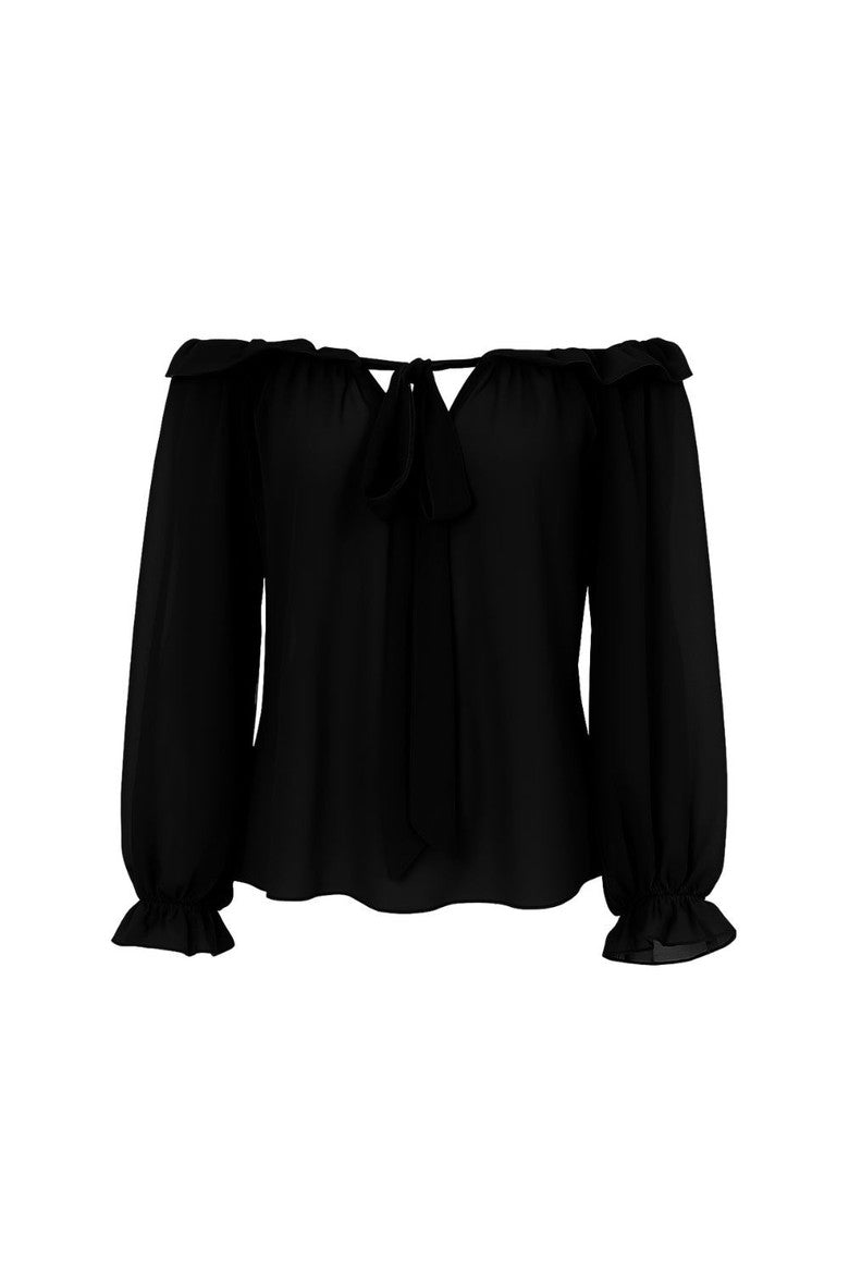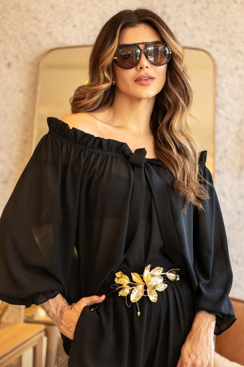 Seu caimento fluido valoriza a silhueta com delicadeza, enquanto o elástico na parte superior permite um uso versátil no estilo ciganinha, realçando os ombros com charme. O laço central no busto adiciona um toque romântico e feminino, e as mangas com elástico no punho completam o visual com elegante e movimento.