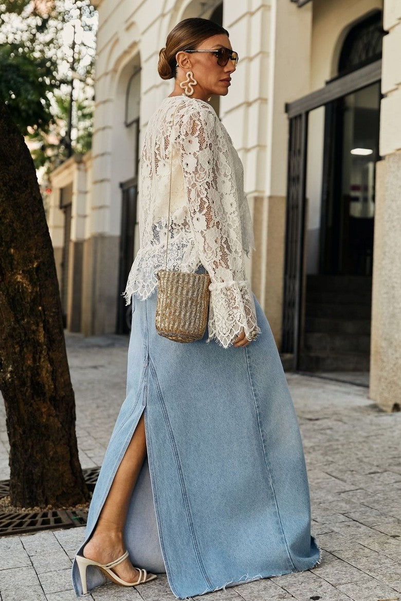 Bata Renata em renda delicada, exala romantismo e leveza. Com mangas longas e decotes em V, valorizam o colo com elegante, enquanto os babados na barra e nos punhos adicionam movimento e charme à peça.