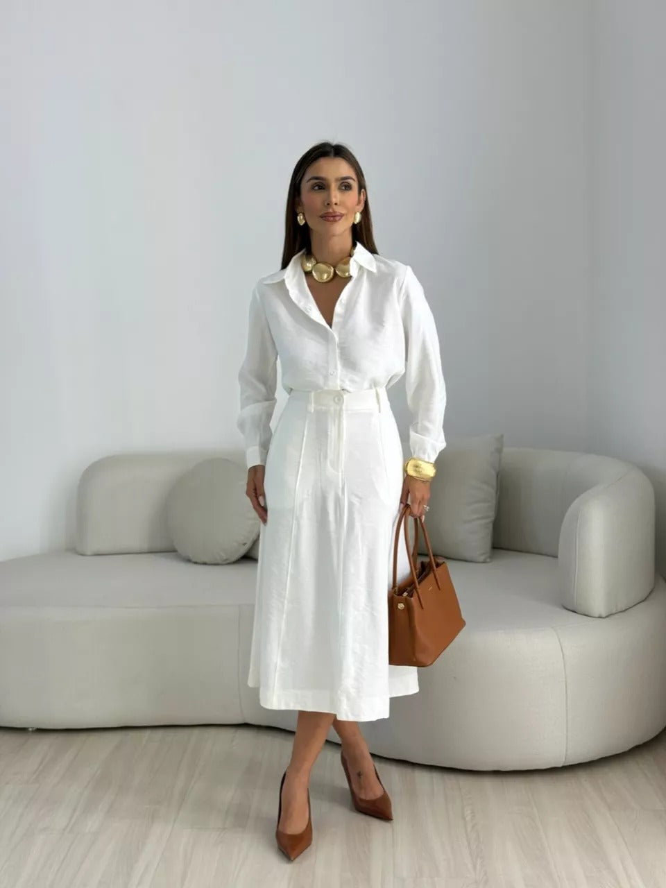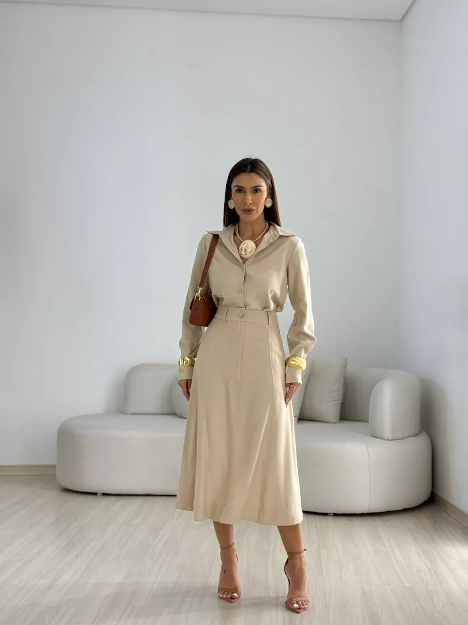 Conjunto moderno e versátil, composto por camisa de manga longa com modelagem solta e saia midi de caimento reto e elegante. A proposta é conforto e sofisticação, permitindo composições que vão do casual ao social, dependendo dos acessórios escolhidos. Ideal para quem busca praticidade sem abrir mão de estilo refinado.