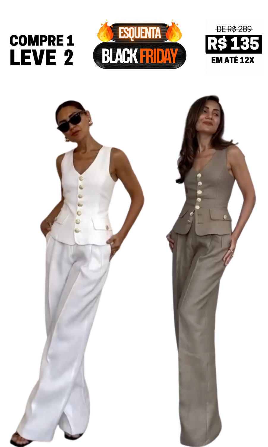 O Conjunto Valentina Prado traz a elegância minimalista em um design de alfaiataria refinado. O colete estruturado com botões dourados e a calça de caimento reto unem sofisticação e modernidade em uma proposta versátil e impactante.
