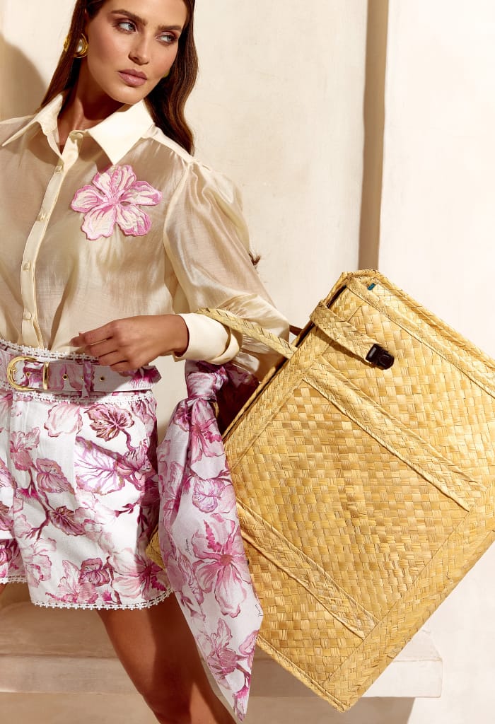 O modelo acompanha cinto forrado no mesmo tecido, que realça a cintura com charme, enquanto o detalhe em viés de guipir em formato delicado floral adiciona um toque artesanal e romântico, elevando a peça a um patamar de exclusividade.
