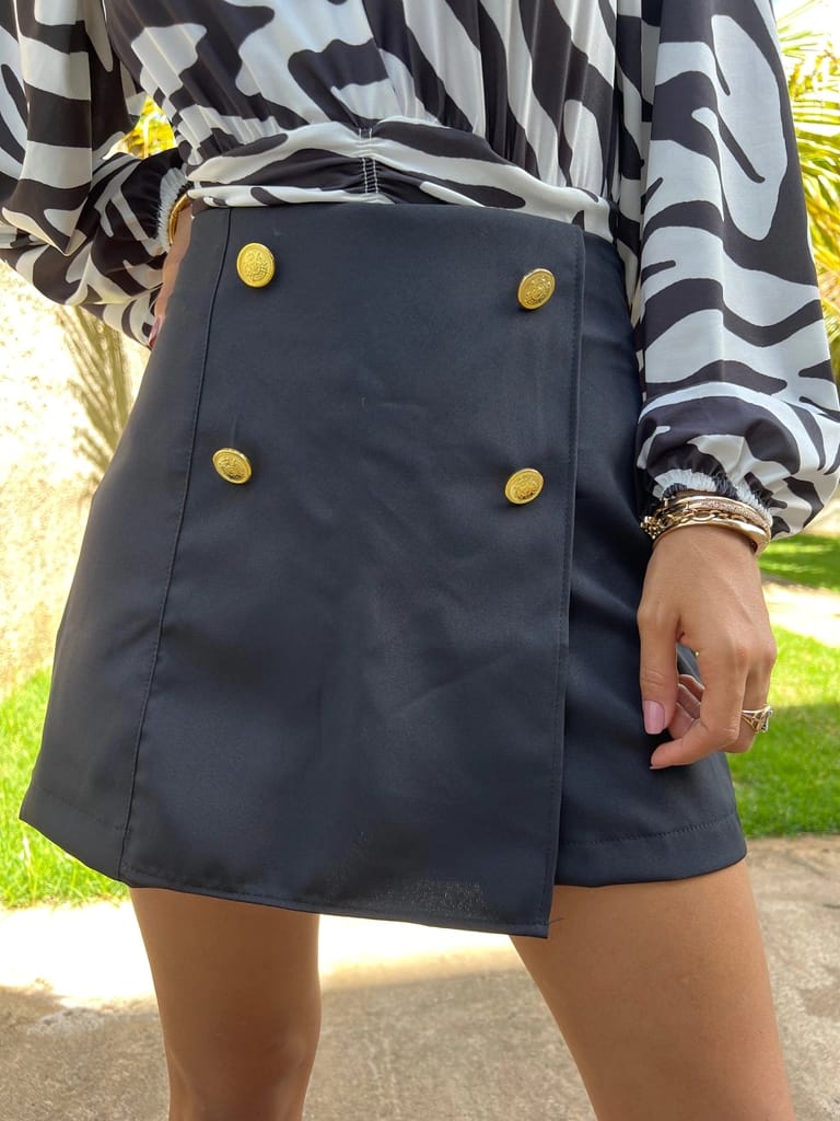 A saia curta é uma peça versátil e estilosa, que combina conforto e moda. A parte da frente apresenta um recorte de saia sobreposta, com botões decorativos, enquanto o short por baixo garante liberdade de movimento e segurança. Possui fechamento com zíper lateral invisível e é completamente forrado, proporcionando maior conforto. A composição do tecido é 96% Poliéster e 4% Elastano, oferecendo um toque suave e leve.