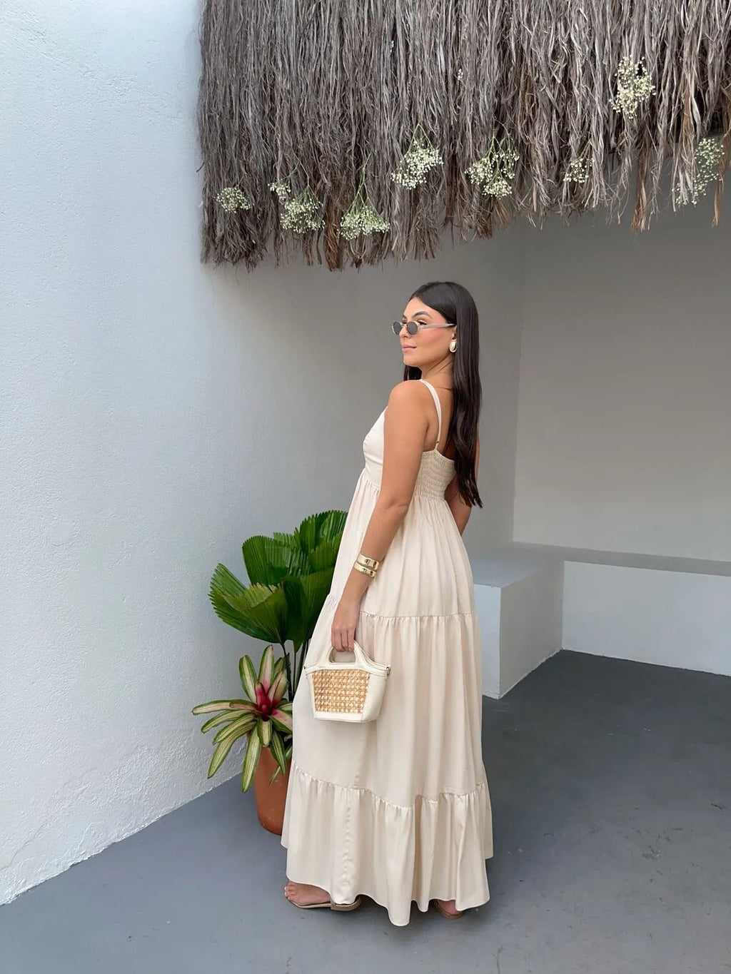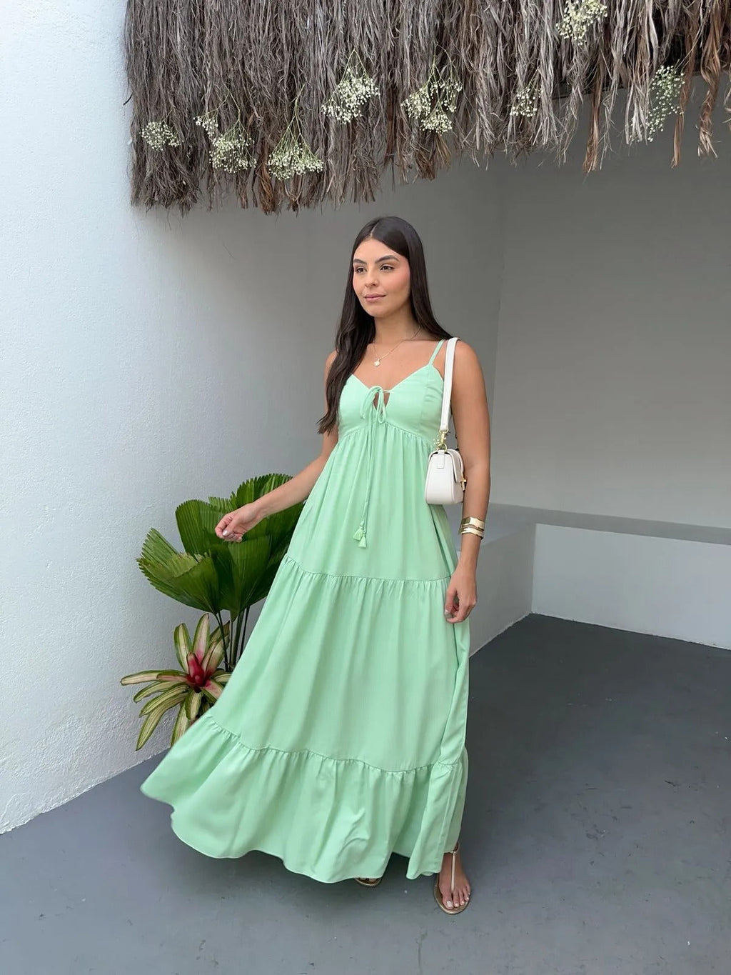 Vestido longo confeccionado em viscose leve e fresco , ideal para dias quentes e produções casuais cheias de charme. O modelo conta com alças finas reguláveis, decote em “V” com detalhe de amarração frontal e busto franzido que garantem melhor ajuste ao corpo. A saia em camadas amplas traz movimento fluido e um visual romântico, perfeito para graça ao ar livre ou encontros descontraídos.
