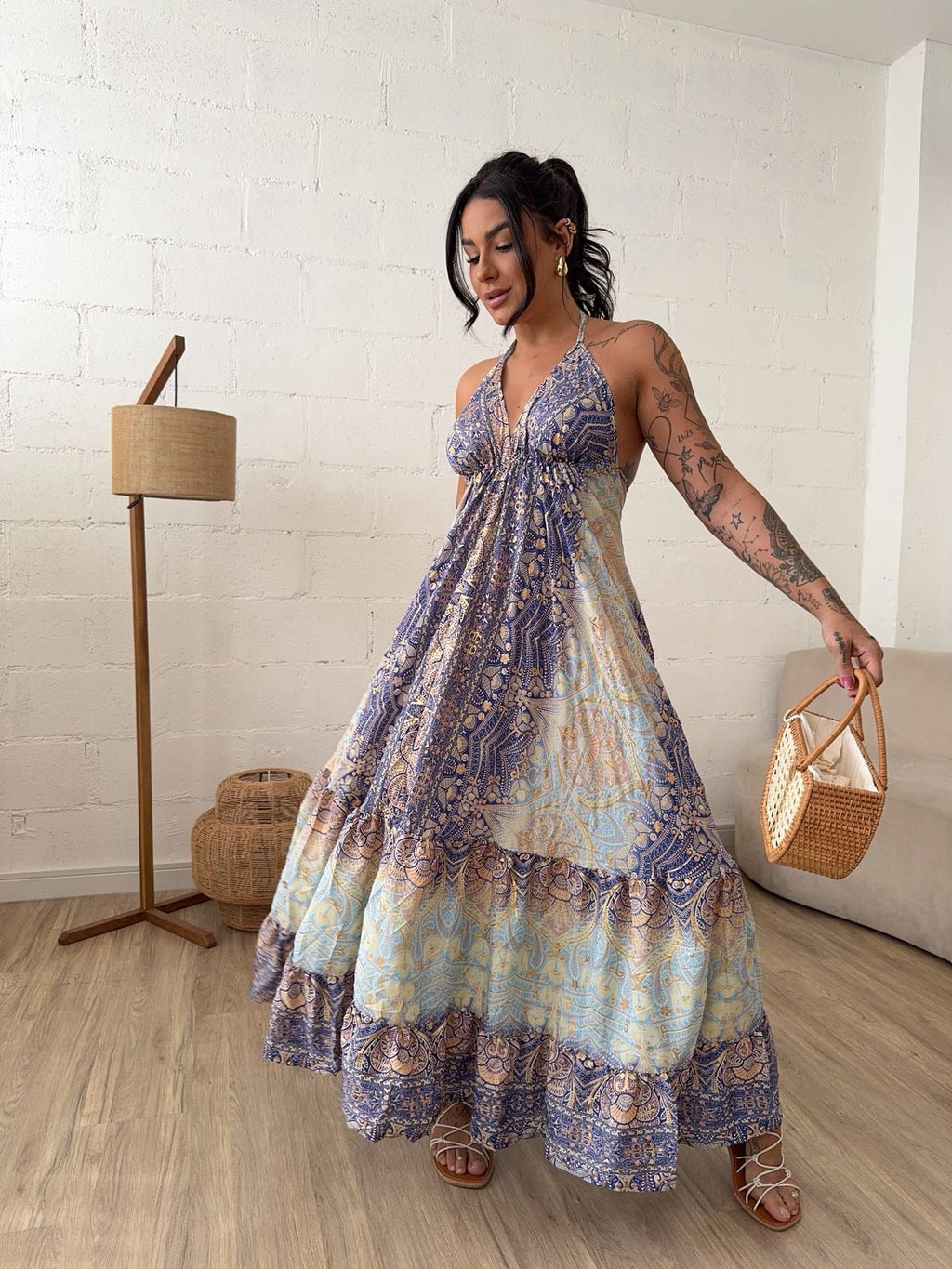 Esse é aquele tecido super fluido, sua composição é 100% viscose, e tem alças que permitem amarrações diferentes.